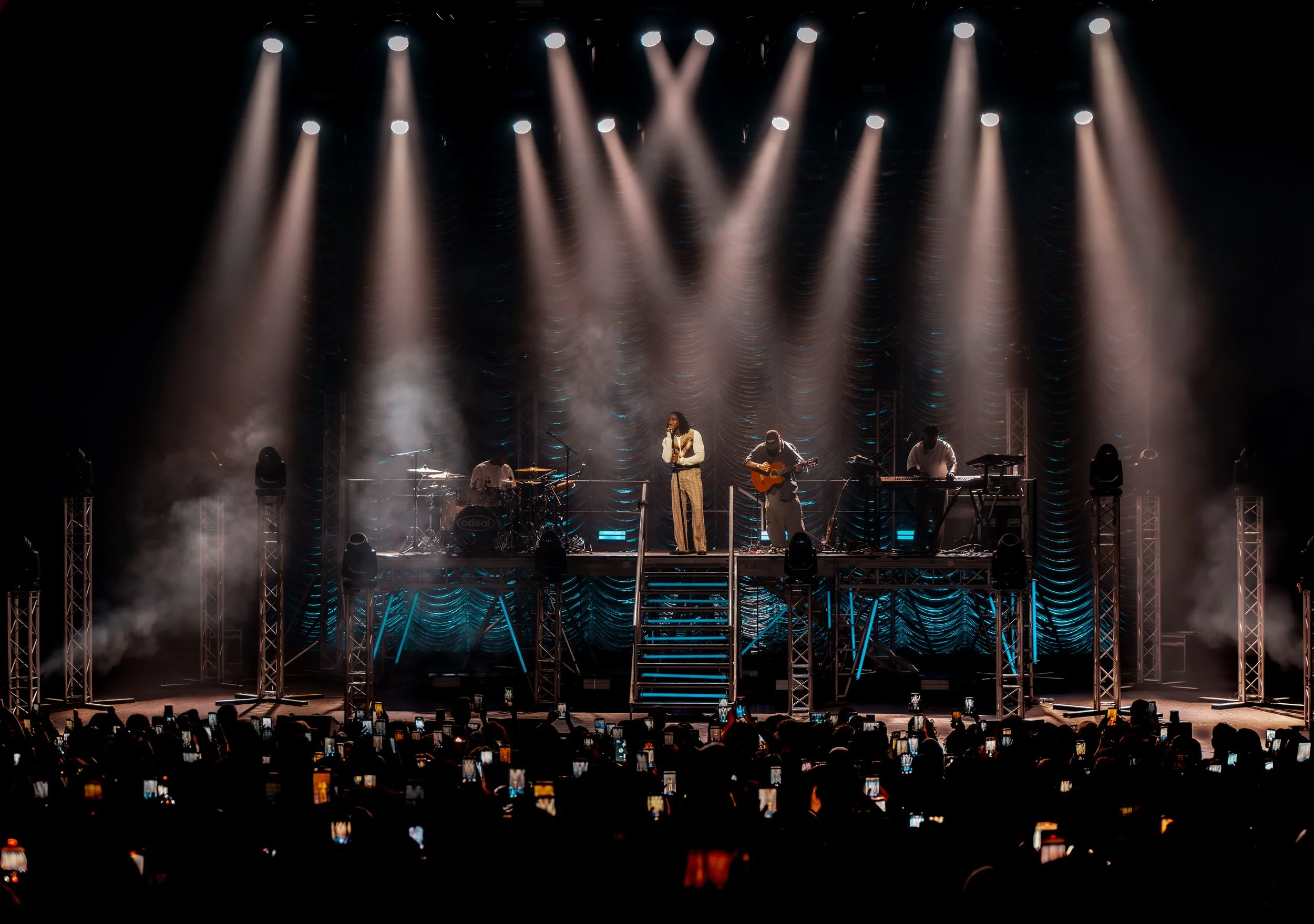 Immediately drawing the audience in with captivating smooth vocals and live band situated on an elevated platform, the cinematic-like opening with early OVMBR-era songs Free Me and Hold You Down, made the atmosphere feel almost weightless, like memories playing back in soft focus; foundational Odeal.